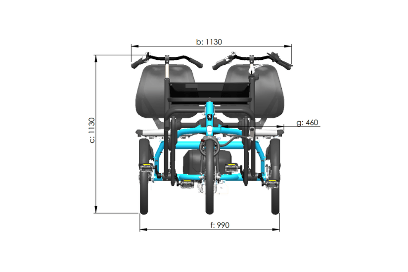 The Fun2Go is a double rider cycle/ three-wheel tandem where the users sit beside each other. One person steers, both can pedal. The two persons have a good view and can communicate well with each other due to the seats being next to each other. The riders can get on without having to step through and the seats can easily be adjusted to the required distance with a lever. The seats can also optionally rotate, making it even easier to get on. The maneuverability of the Fun2Go side-by-side tandem bike is enormous, with two wheels all the way behind and one front wheel, it can turn around its own axis.