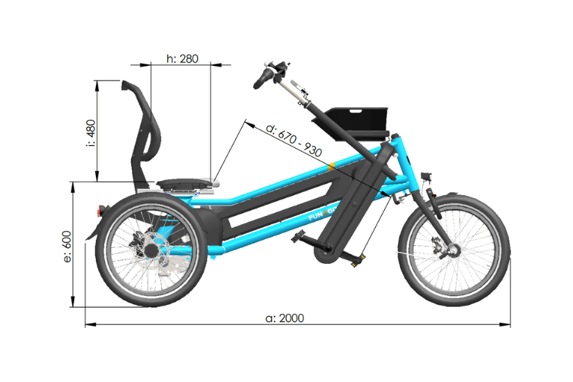The Fun2Go is optionally available with a reinforced frame. A single seat of the Fun2Go is suitable for individuals weighing up to 180 kg. When two people are seated on the Fun2Go, the bike can carry a total weight of up to 280 kg (distributed across the 2 seats).