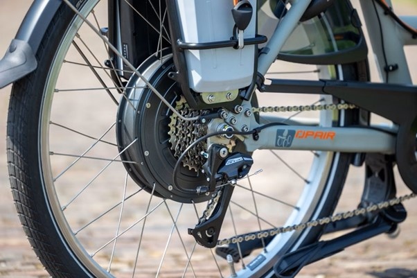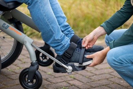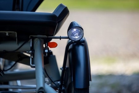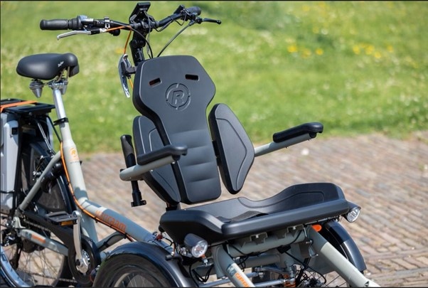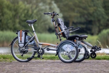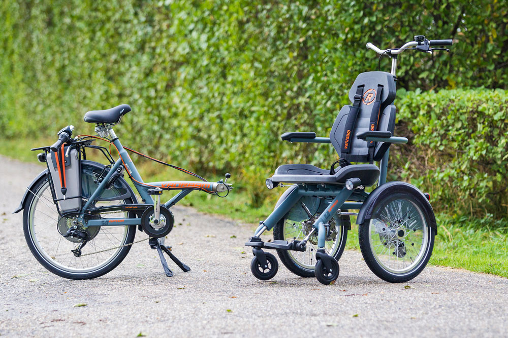 The depth adjustable seat of the OPair can be set to the passenger's measurements as well as the angle adjustable back rest and expandable side rests. There are also options for side rests, making the bike suitable for both children and small adults. The comfortable seat for the passenger has an accessible entry with foldable footrests. The bike can be altered completely with a variety of options. A personal seat can be affixed to the bike. For all the options available for this bike, see our configurator or the pricelist of the OPair. The optional electric motor provides support while cycling. Read everything about electric pedal support (Pedelec) for this bike.