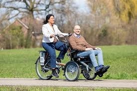 The OPair is a wheelchair bike with which you can transport a wheelchair user. A seat for the wheelchair user/passenger is affixed to the front of the bike. From the back, the cyclist has an overview on the road and view on the passenger. On the split frame version, the front part is easy to remove from the cycling component, which enables use as a wheelchair on location. The slightly angled front wheels provide increased driving comfort and stability. The OPair wheelchair bike has a modern design.